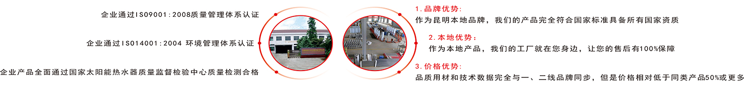 昆明安居樂業太陽能設備有限公司是集科研、生產、銷售、安裝、維修及售后服務為一體的專業化太陽能熱水器生產廠家制造企業。公司成立于2006年3月(公司前身為成立于1998年5月的“昆明誠信陽光太陽能廠”),生產研發基地占地面積近29畝,座落于依山傍水的昆明市大板橋工業園旁的李其村委會上李其村。公司自創建之日起,一直堅持“誠信經營、創新發展、品質為先、服務至上”的經營管理理念,一步一個腳印,一年一個臺階,穩步持續地發展;公司的每位員工始終踐行著“科技創業,品質興業,雙贏建業”的戰略文化內涵,高起點、高標準、嚴要求、重細節致力于改進提高和完善產品質量及安裝與售后服務水平。公司在秉承傳統太陽能熱水器行業成熟科技成果的基礎上,同云南師范大學太陽能研究所、國家新能源工程技術研究中心等單位建立了良好的合作關系,并努力發揮自身的技術優勢,依靠先進的生產設備、以及不斷優化的生產工藝和完善的檢測設施,連續開發生產出以“榮益誠信陽光”為主打品牌,以真空集熱管為集熱核心組件的六大系列、全規格型號的十六個太陽能集熱器單品,在適應不同地域、不同消費層次、不同家庭、不同使用場所的同時,滿足了廣大客戶的熱水需求,真正為廣大群眾帶來溫暖的享受。特別值得一提的是,“榮益誠信陽光”太陽能在太陽能熱水工程領域中,有著自己獨特的設計理念,可承接不同區域、不同熱負荷、不同使用環境的熱水工程,實現與建筑一體化完美結合;而且針對各企事業單位大、中、小型太陽能熱水系統工程,可進行免費現場設計和成本核算,力爭為客戶提供最經濟、最合理、最規范的熱水工程解決方案。